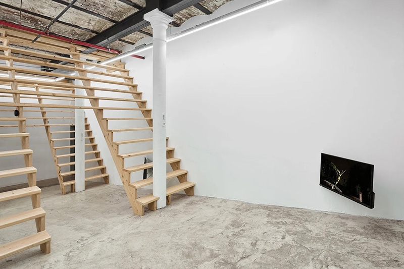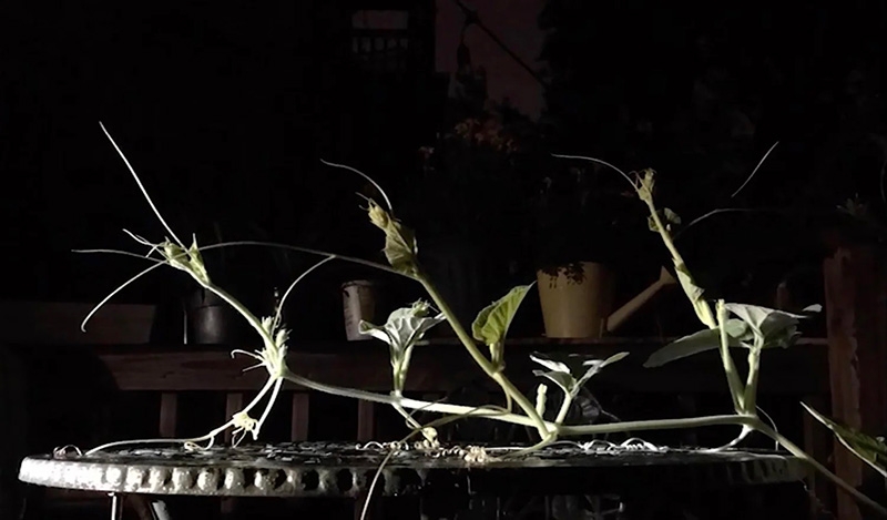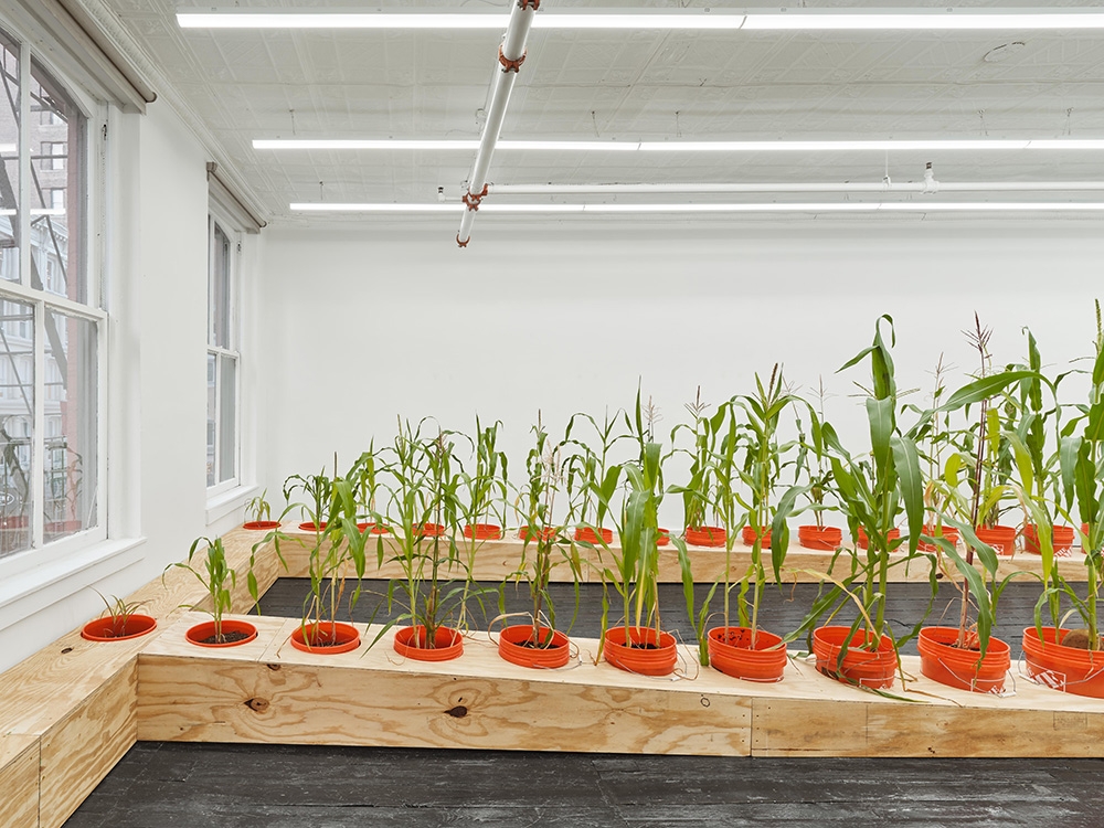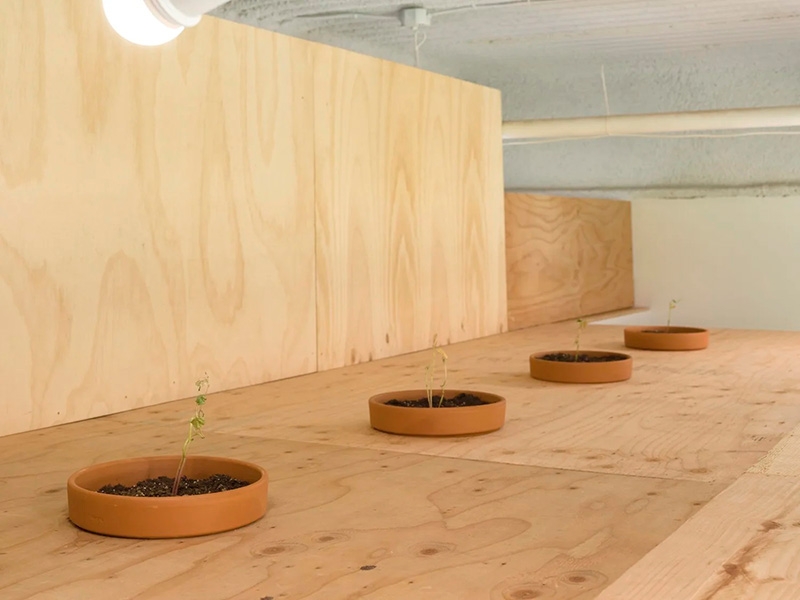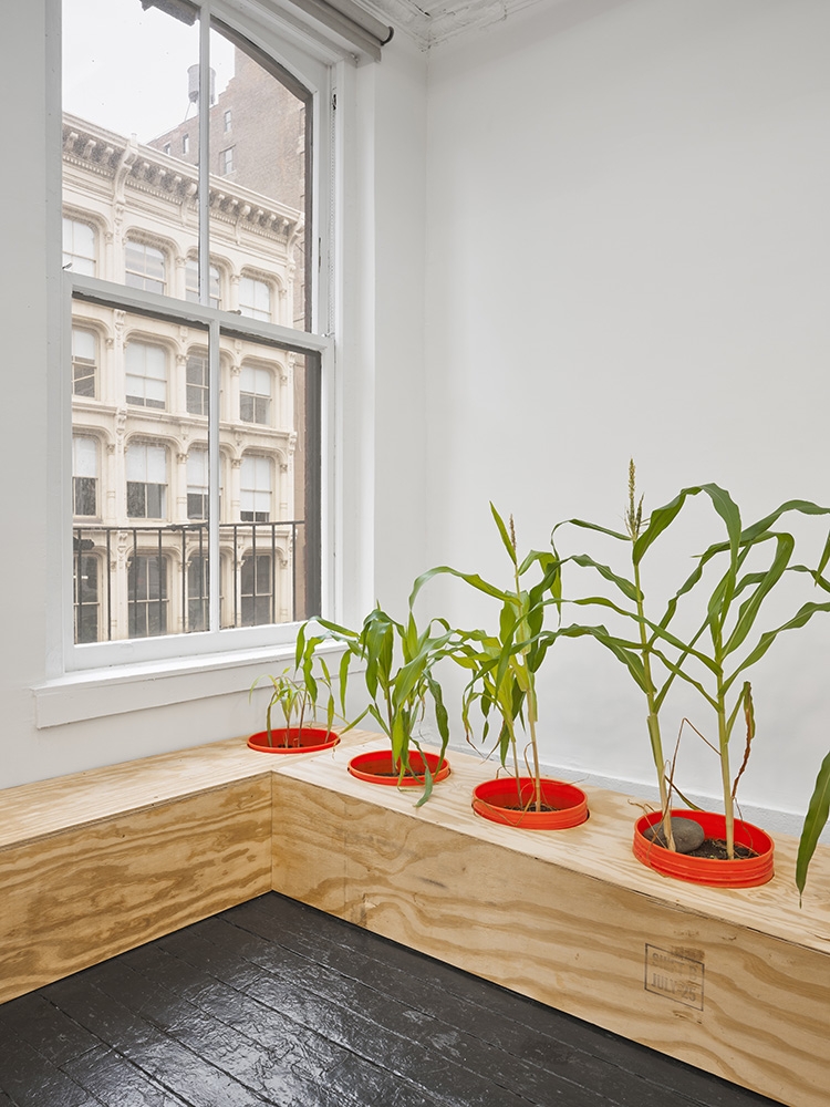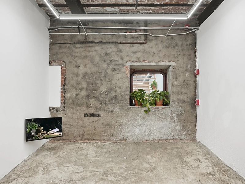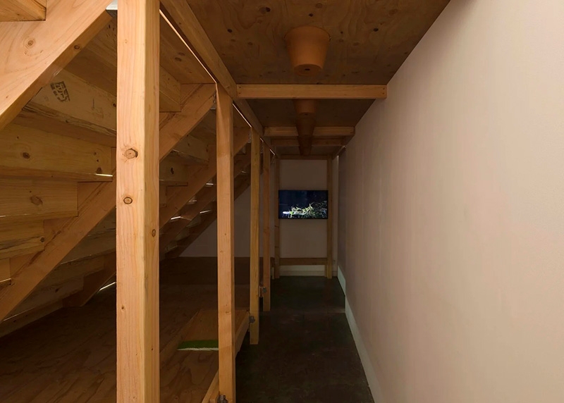 Dimensional lumber, Pothos, 80 videos on 2 monitors, Transducers, Mirror, zine