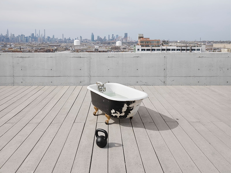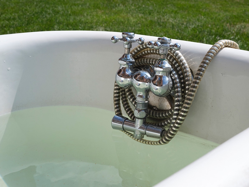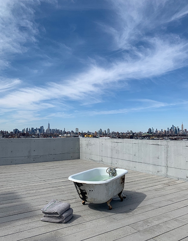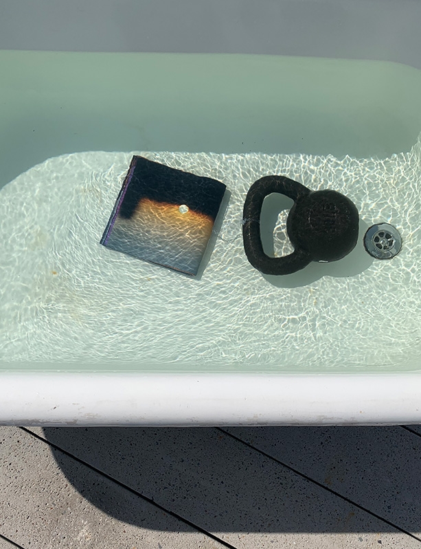 Iron tub, Water, Vinyl book, Fishing line, Bluestone