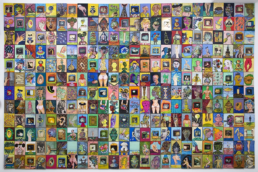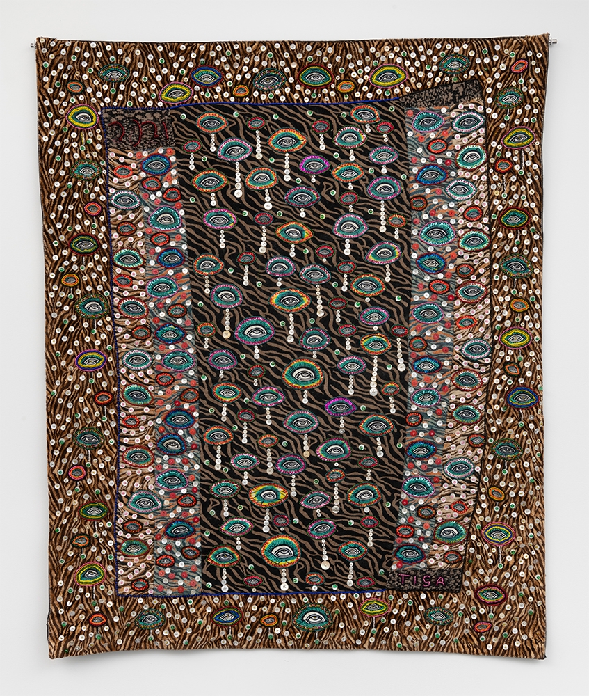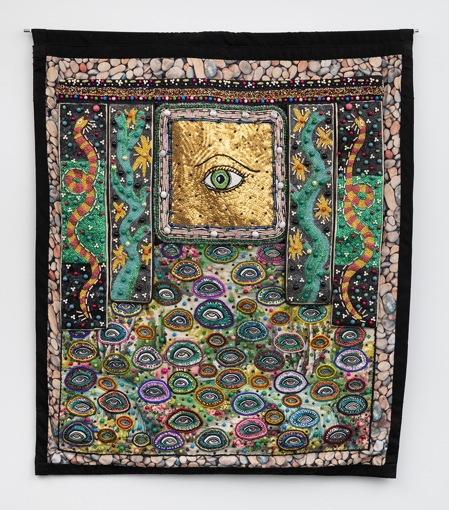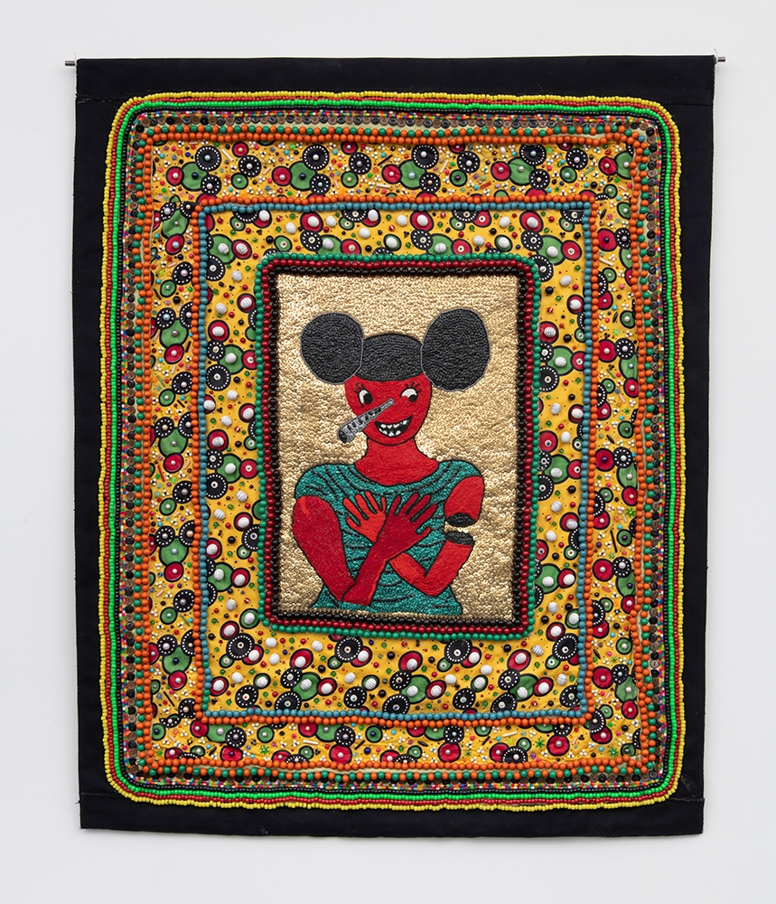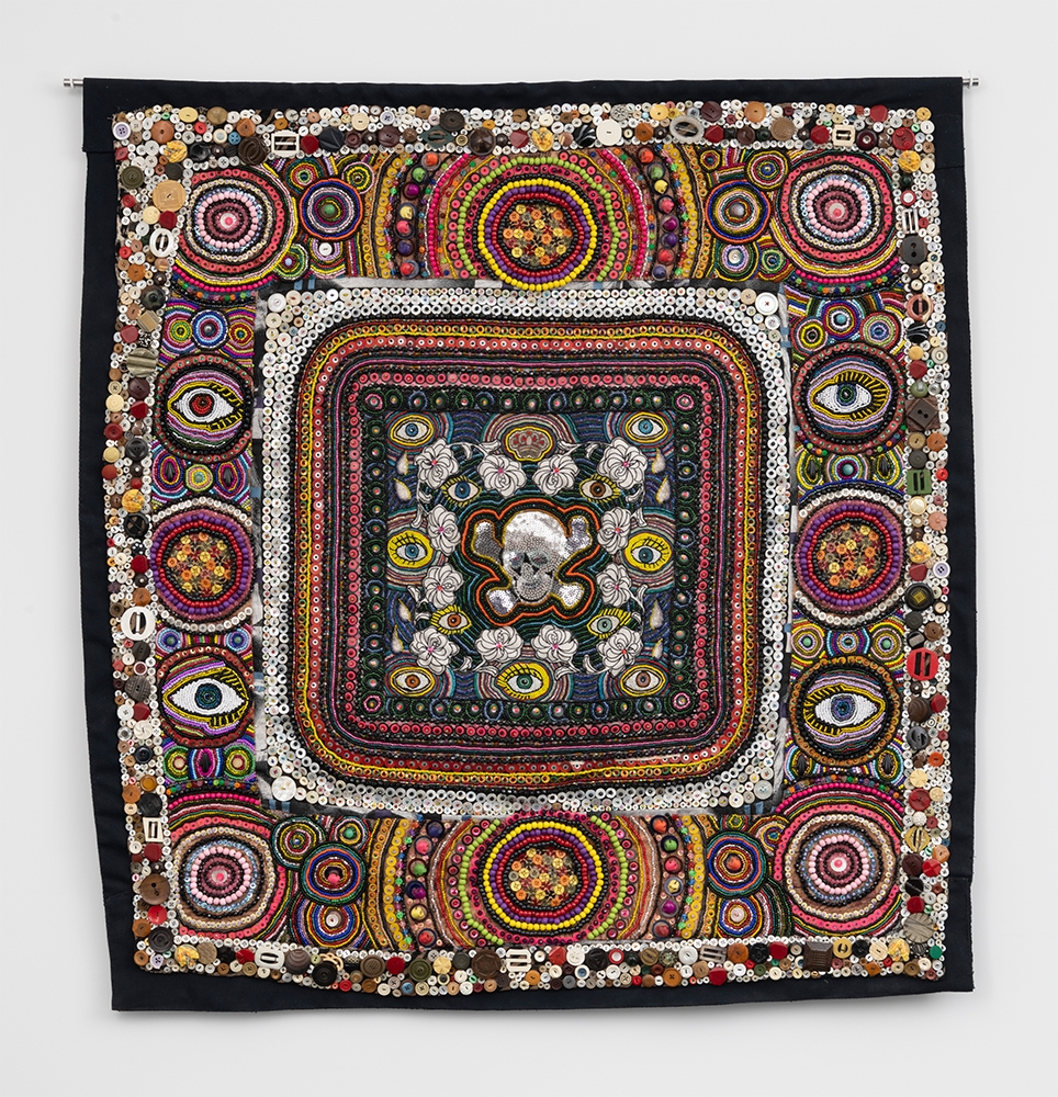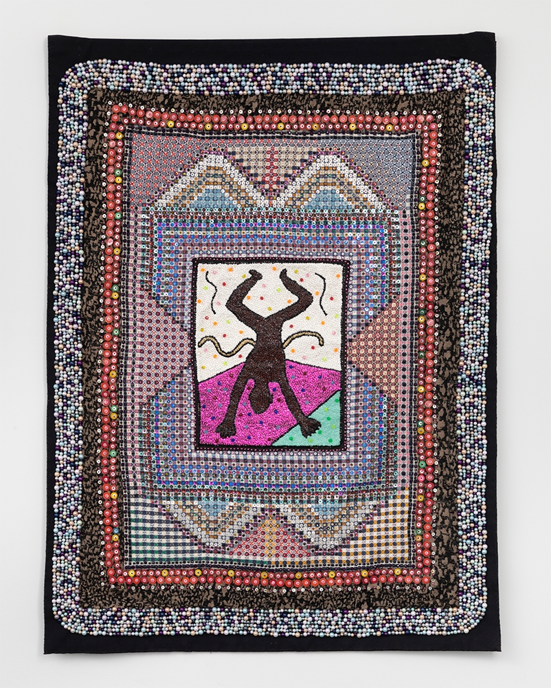 Glass, wood, and plastic beads, sequins on textile mounted on canvas