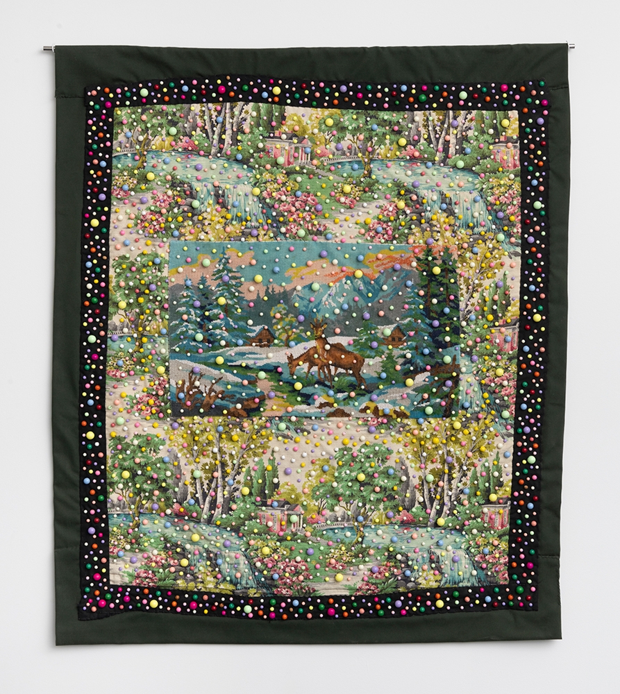 Vintage fabric, found fabric, plastic and glass beads on canvas